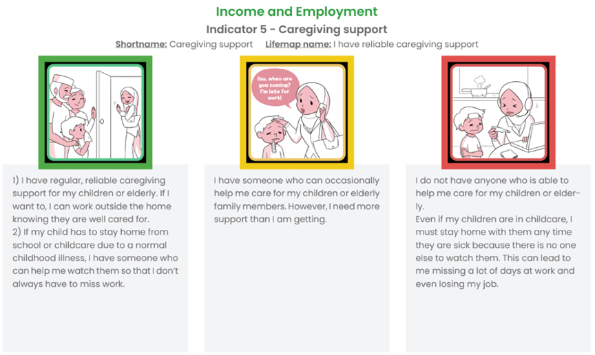 The 6 dimensions are further divided into 45 indicators, adapted to the context of lowered income women in Singapore. Each indicator has the following characteristics: