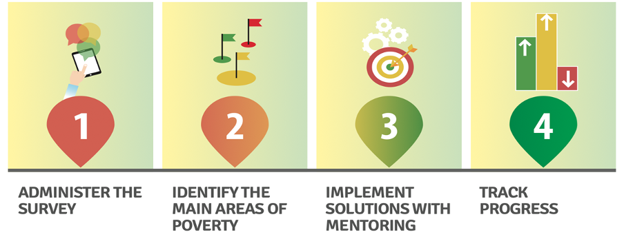 Beyond the colored indicators, this tool also collects qualitative data by analyzing a family’s perception of their ability to change their situation and their motivation to take action. This happens through: