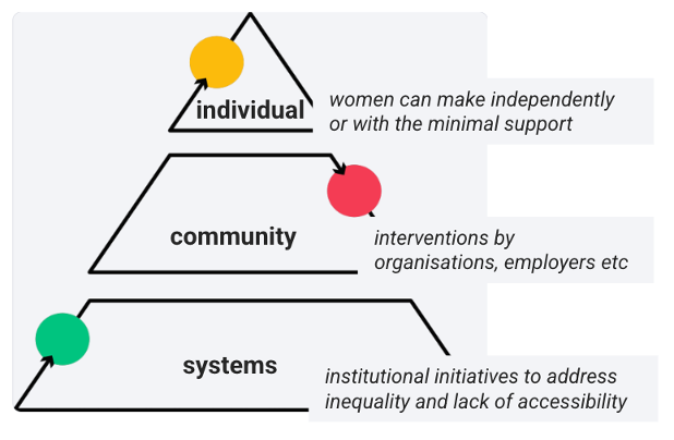 Insight #10: Opportunities to improve stability for lower-income women have to be multi-faceted and targeted, focused on economic, social and psychological wellbeing. They can be taken at the individual level (improvements that women can make independently or with the support of their social network), societal level (interventions by the organisations, employers, etc.) and at the systemic level (higher-level initiatives to address inequality and lack of accessibility).