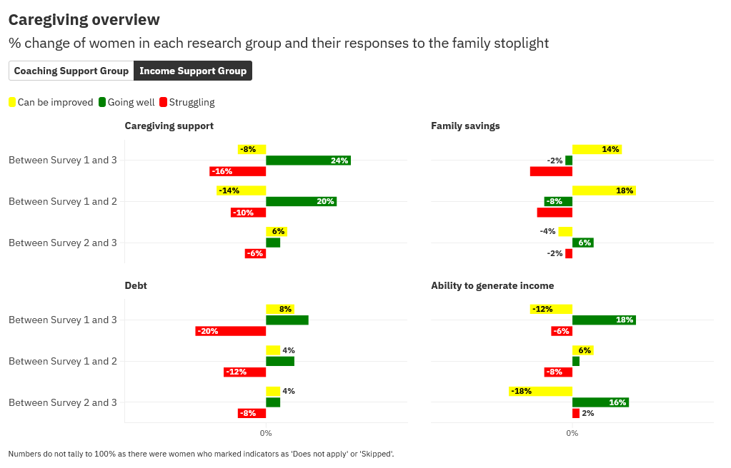 The biggest improvement in the income support group is in Caregiving. While some women did report using the money on student care, and school transportation, there isn’t any other information to suggest why caregiving has seen a big jump.